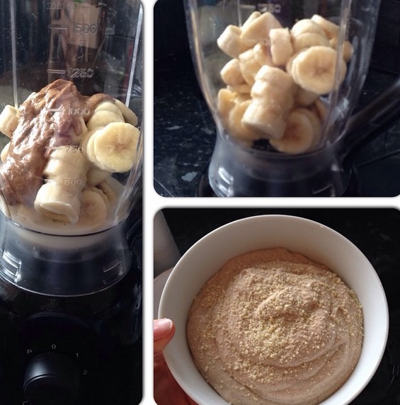 – Once the bananas have frozen put them in a food processor or smoothie maker (I used a smoothie maker and it works just as well) along with the rest of the ingredients and blitz.